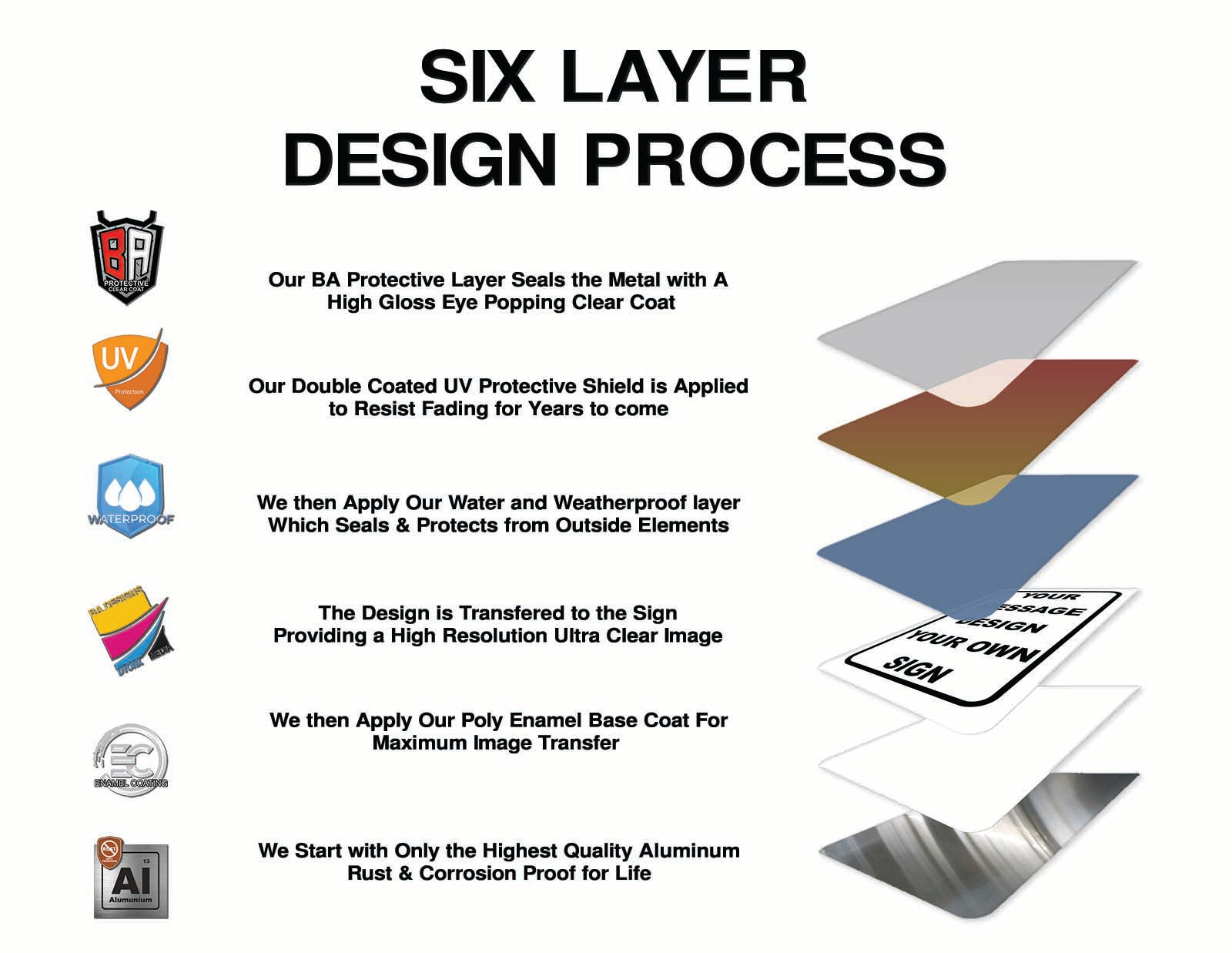 Create the perfect sign for your business, school, or personal use. Signs will last for years and outdoors or indoors. Will never rust, crack or peel.