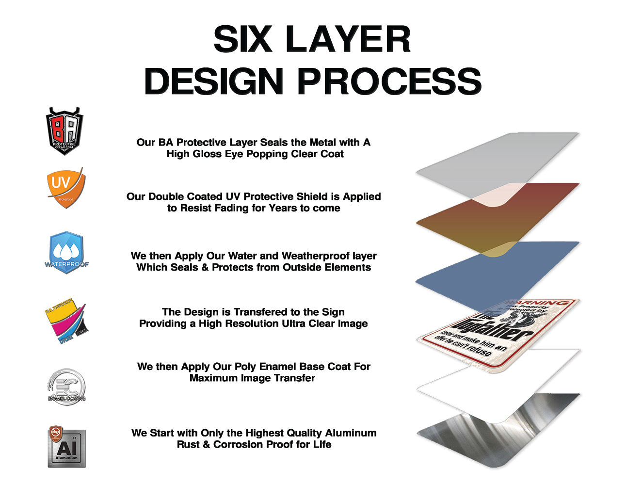 - Indoor and Outdoor, our weatherproof signs can be used anywhere you need them and will last for years to come. The image is cured directly into the sign. No vinyl and will never peel, flake or crack.