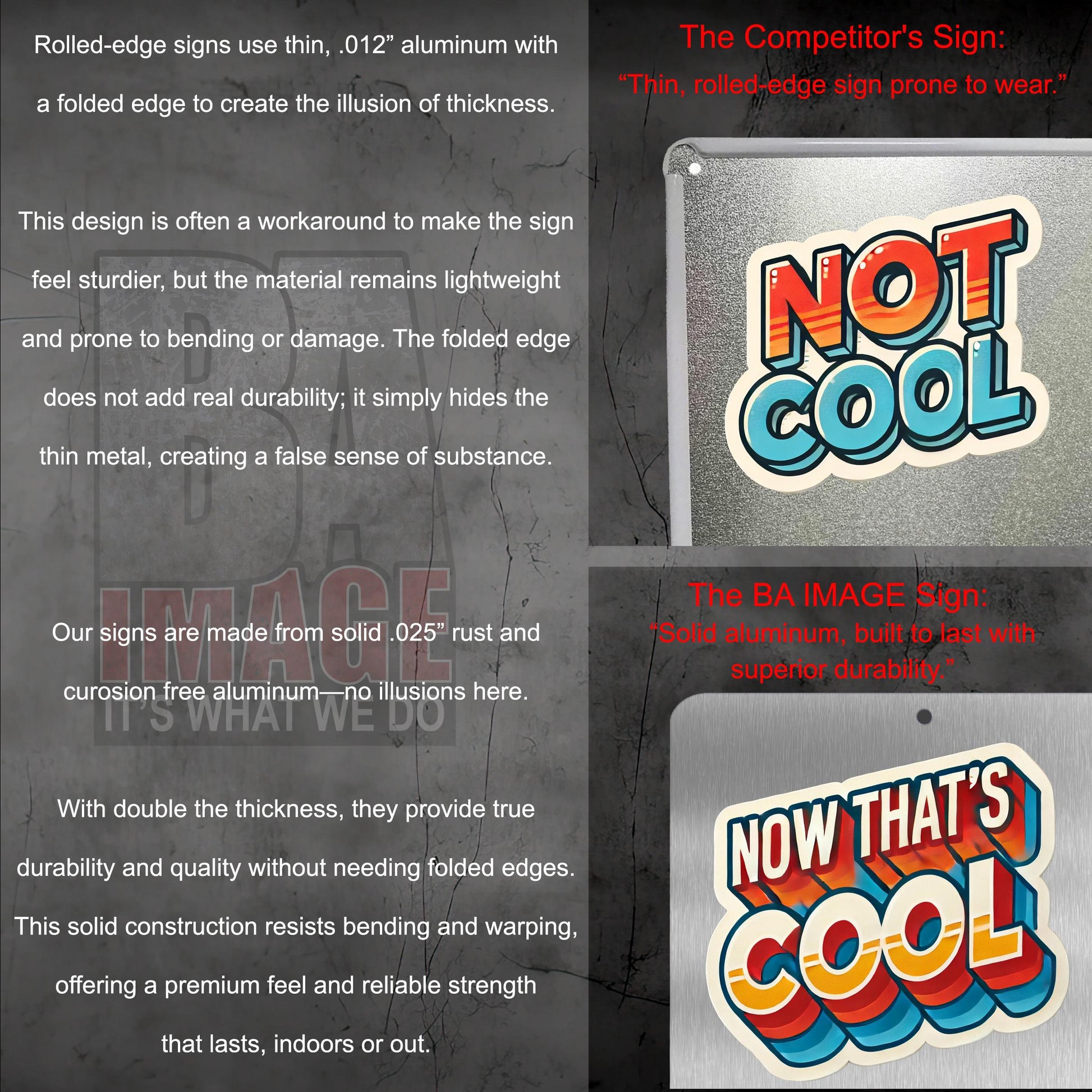 No maintenance needed. Our aluminum signs will not rust, crack or peel and are 100% weather resistant.